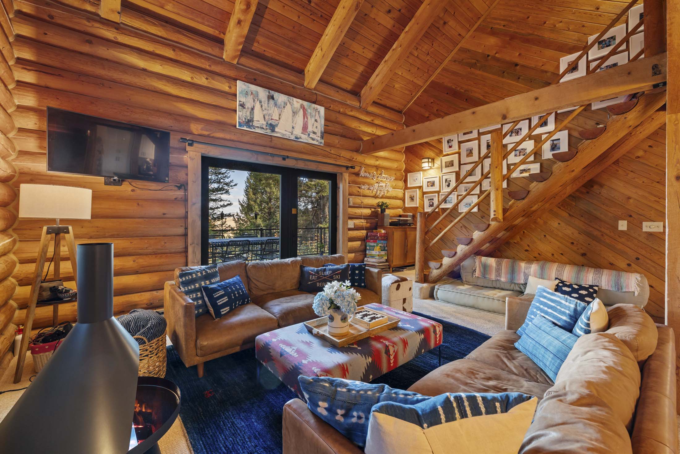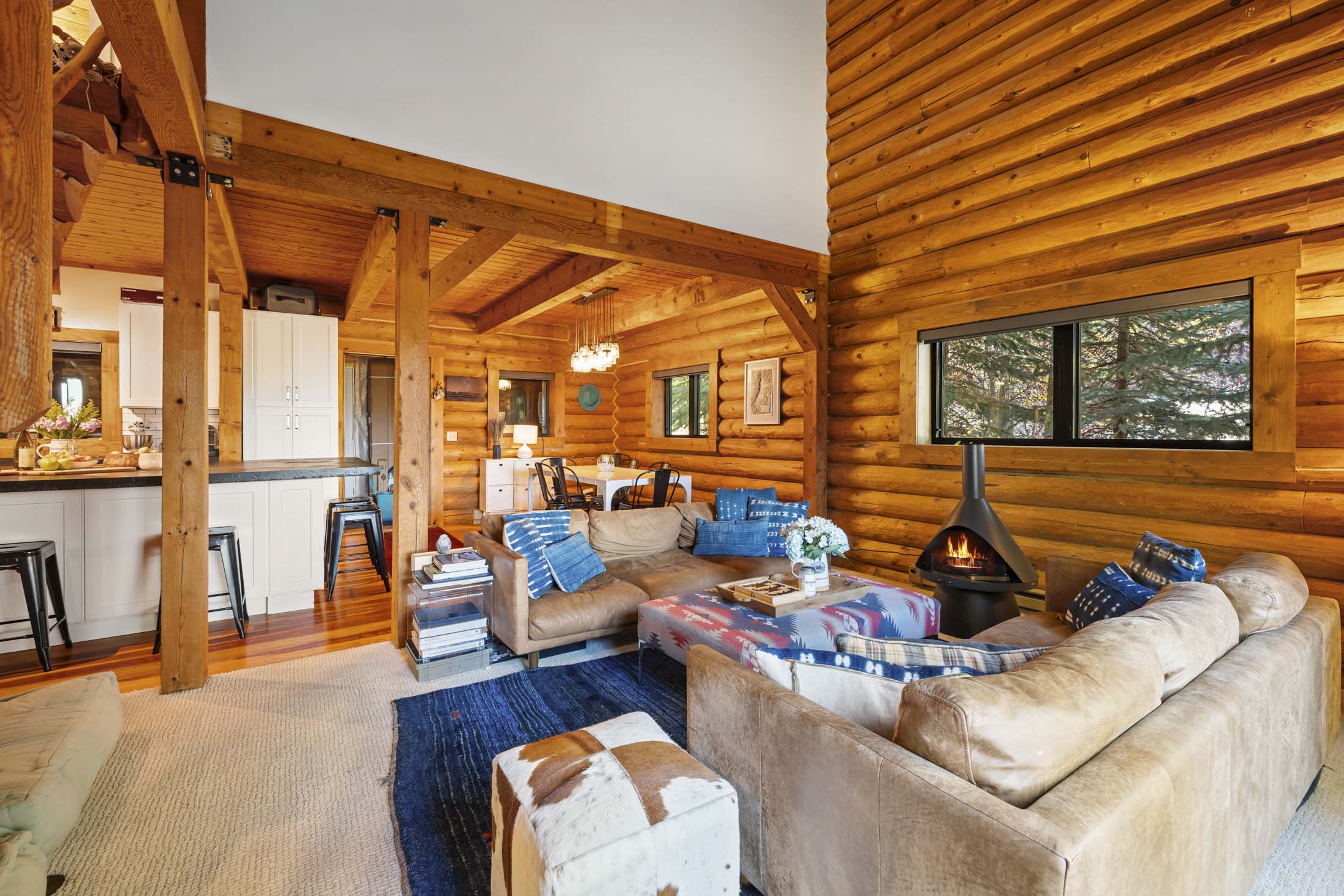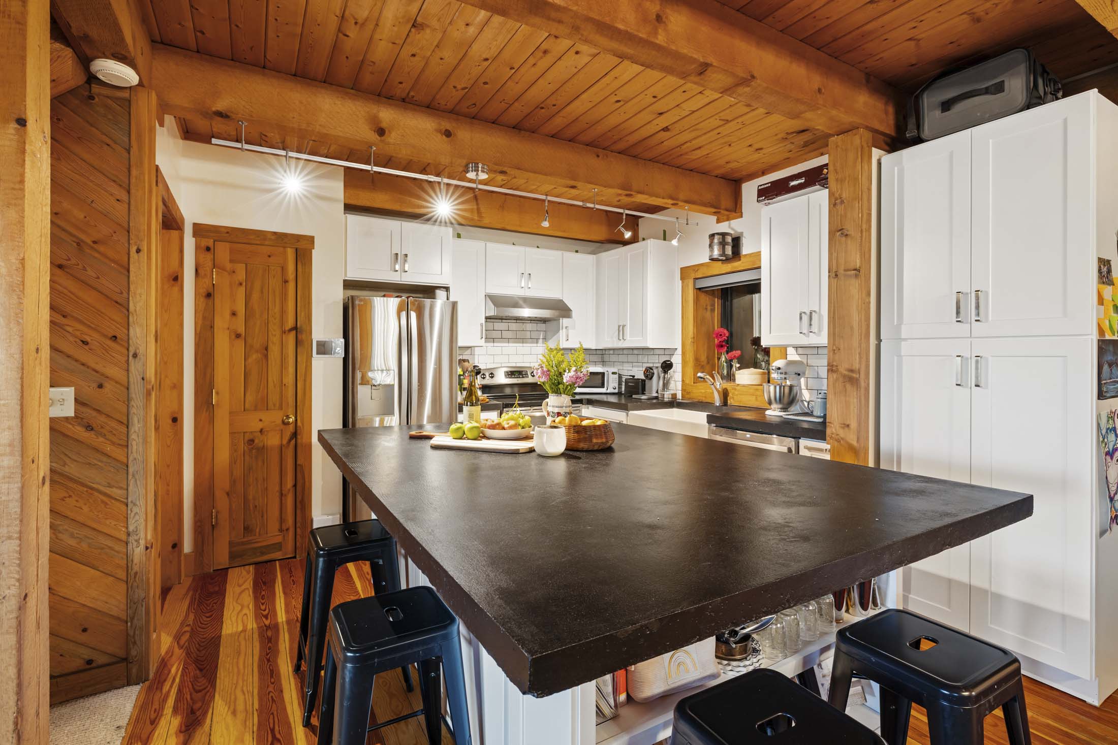 Authentic log construction, exposed beams, and hardwood floors ground the home in classic mountain style. Recent upgrades have meaningfully elevated its livability, most notably a newly renovated kitchen featuring a large central island, black concrete countertops, and modern finishes that contrast cleanly with the rustic structure. This is a substantive improvement that enhances both daily living and entertaining.