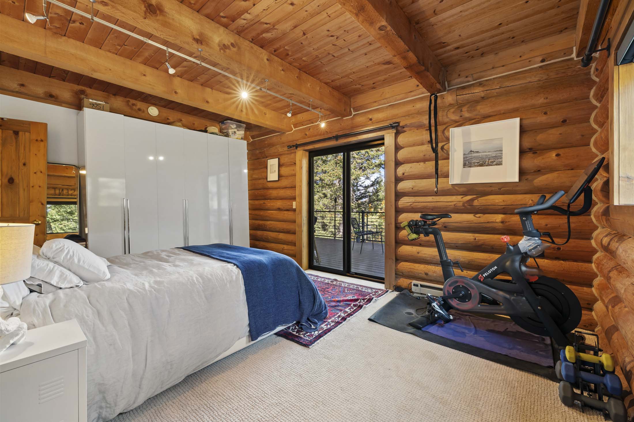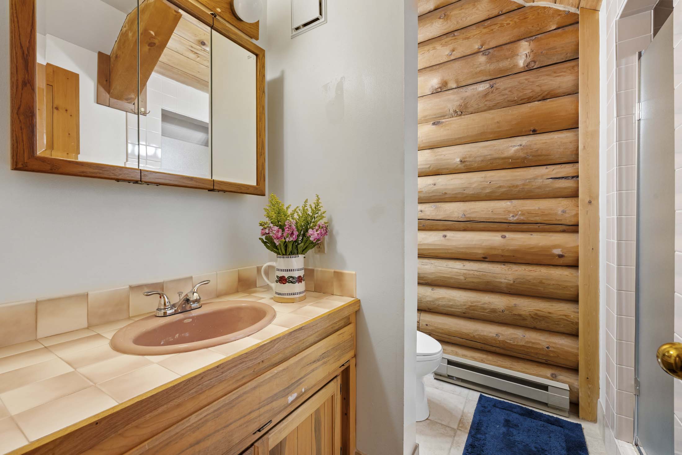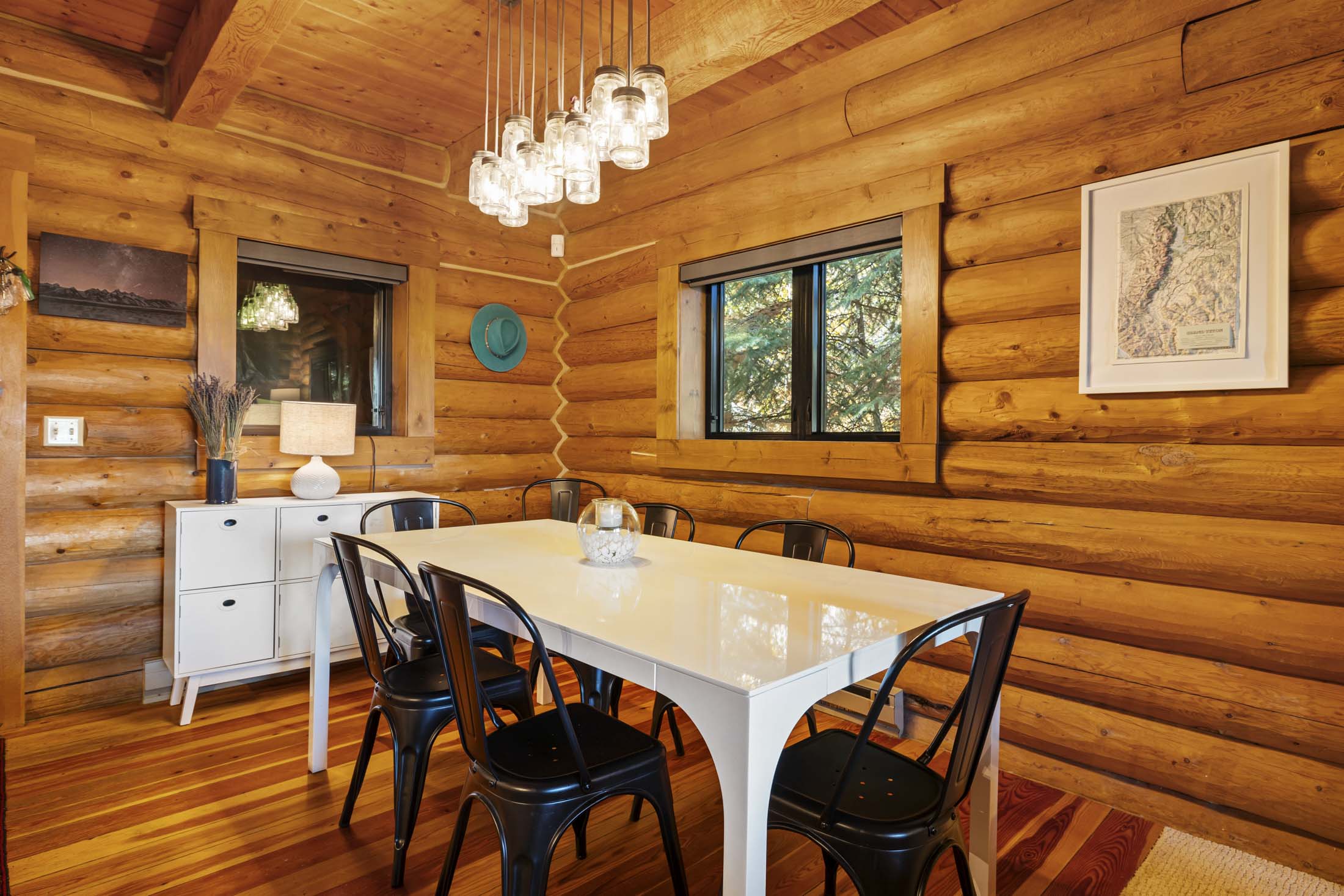 Authentic log construction, exposed beams, and hardwood floors ground the home in classic mountain style. Recent upgrades have meaningfully elevated its livability, most notably a newly renovated kitchen featuring a large central island, black concrete countertops, and modern finishes that contrast cleanly with the rustic structure. This is a substantive improvement that enhances both daily living and entertaining.