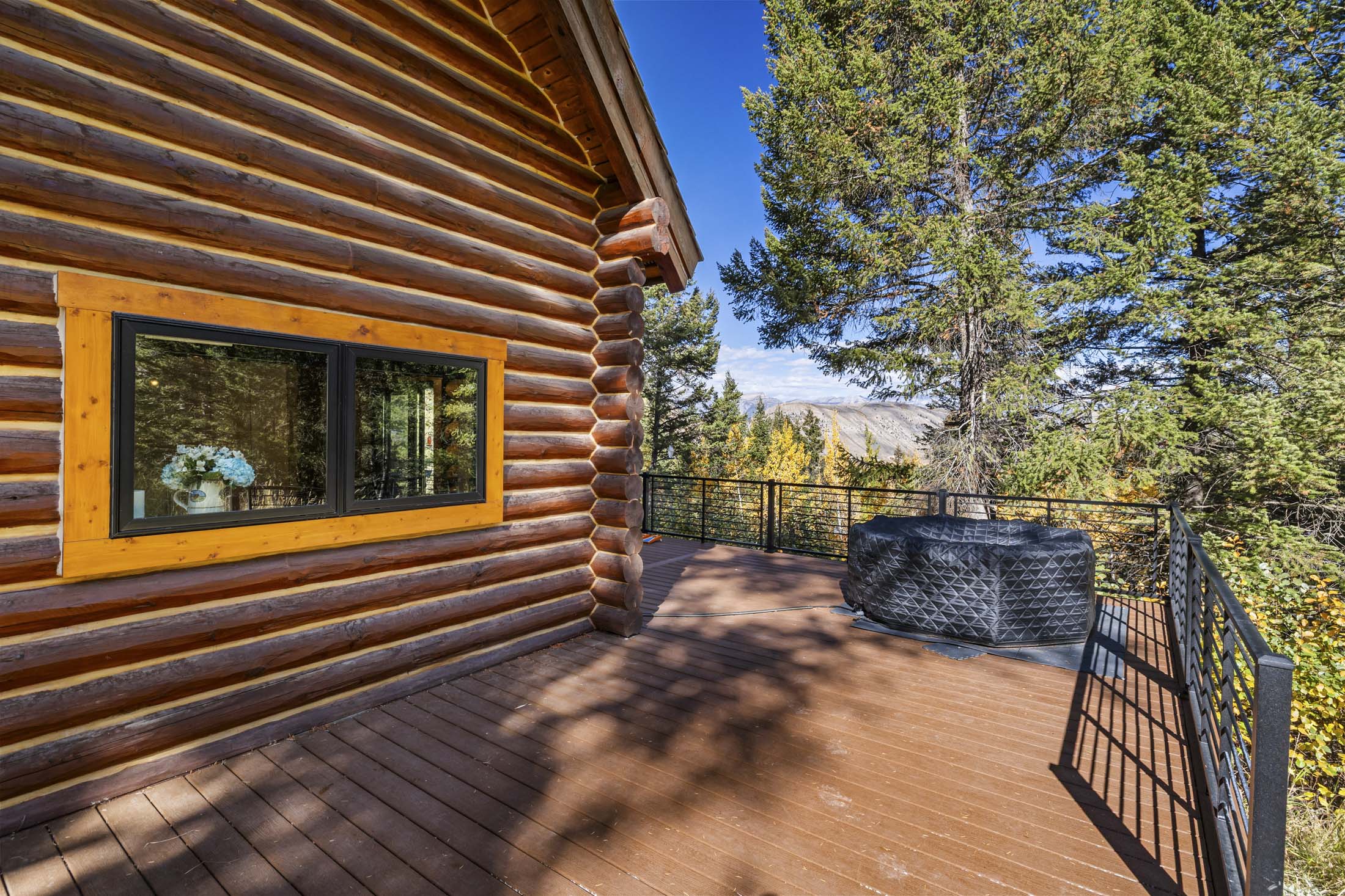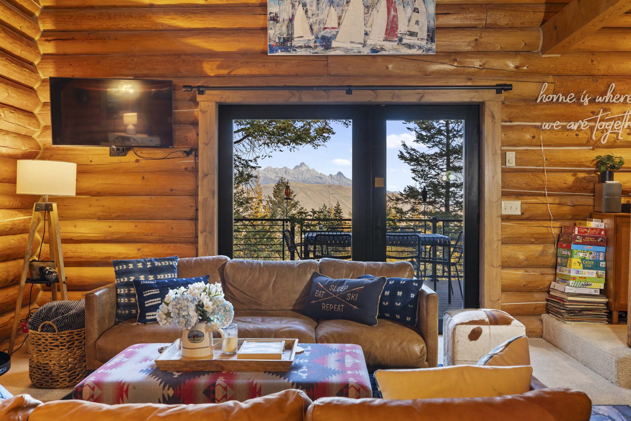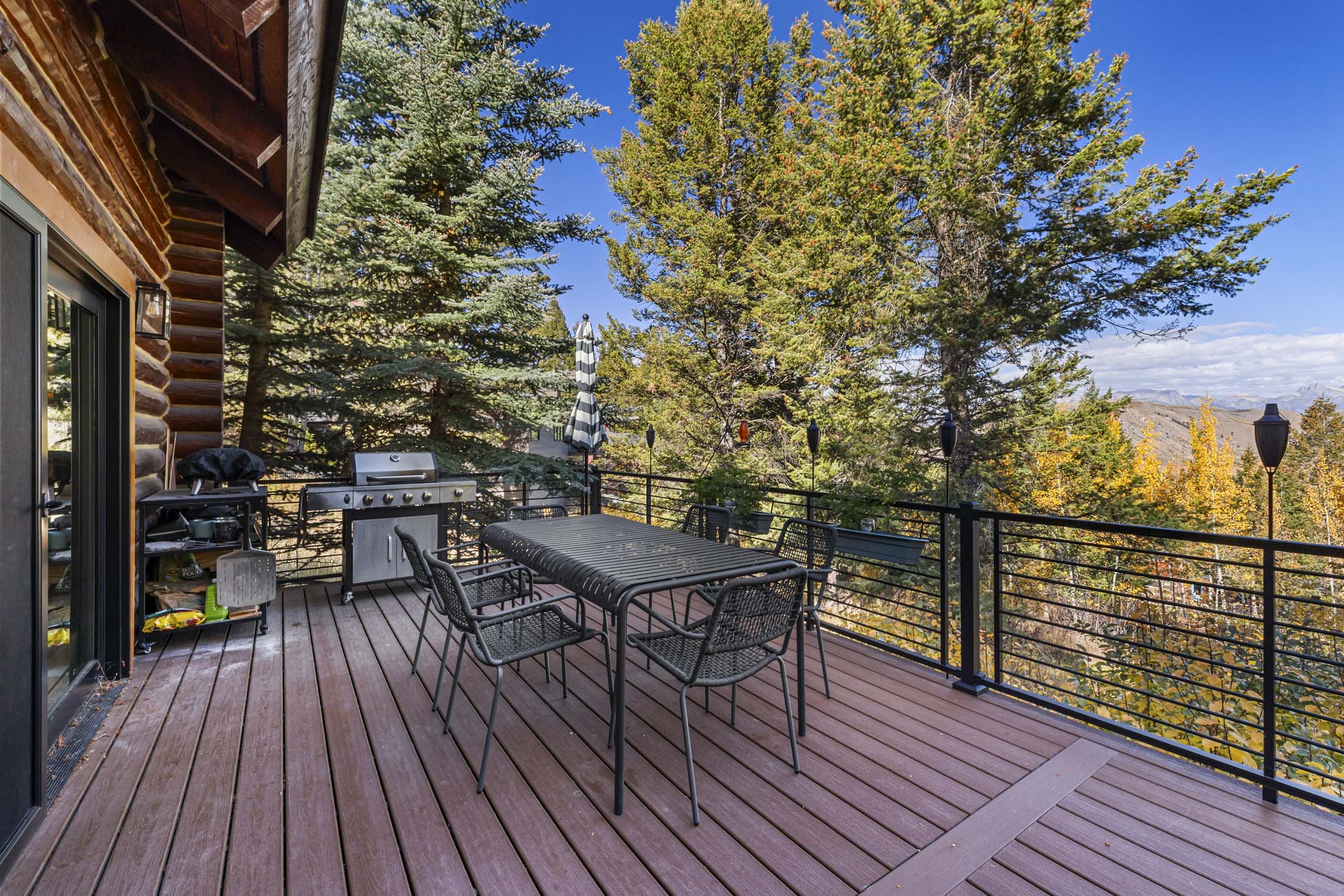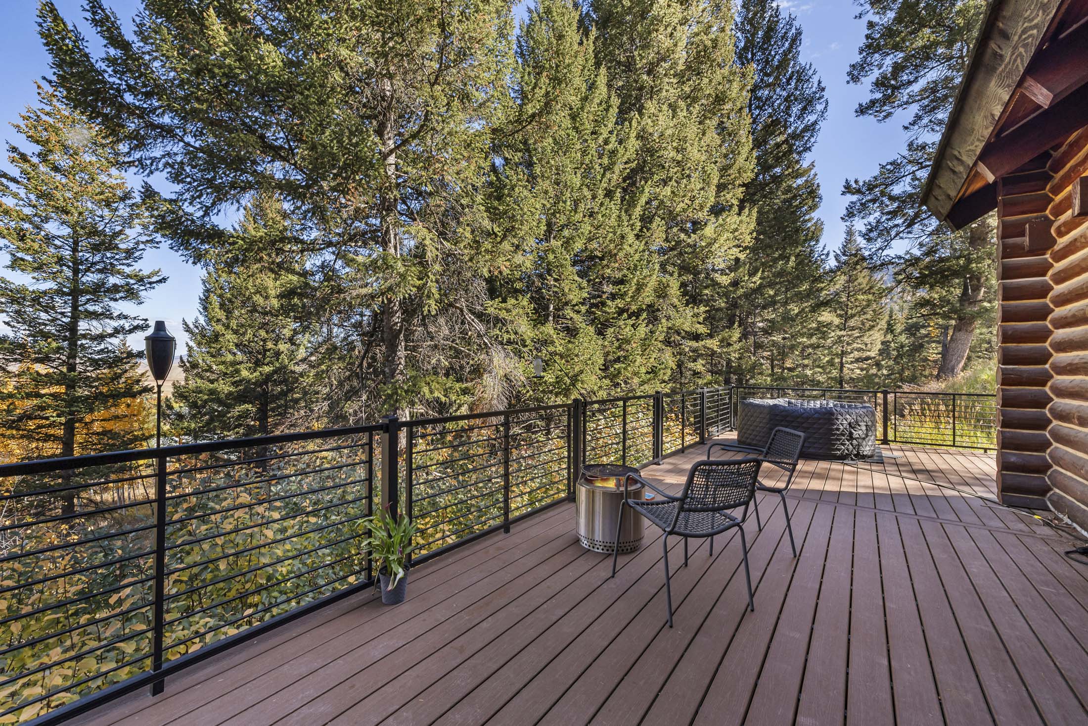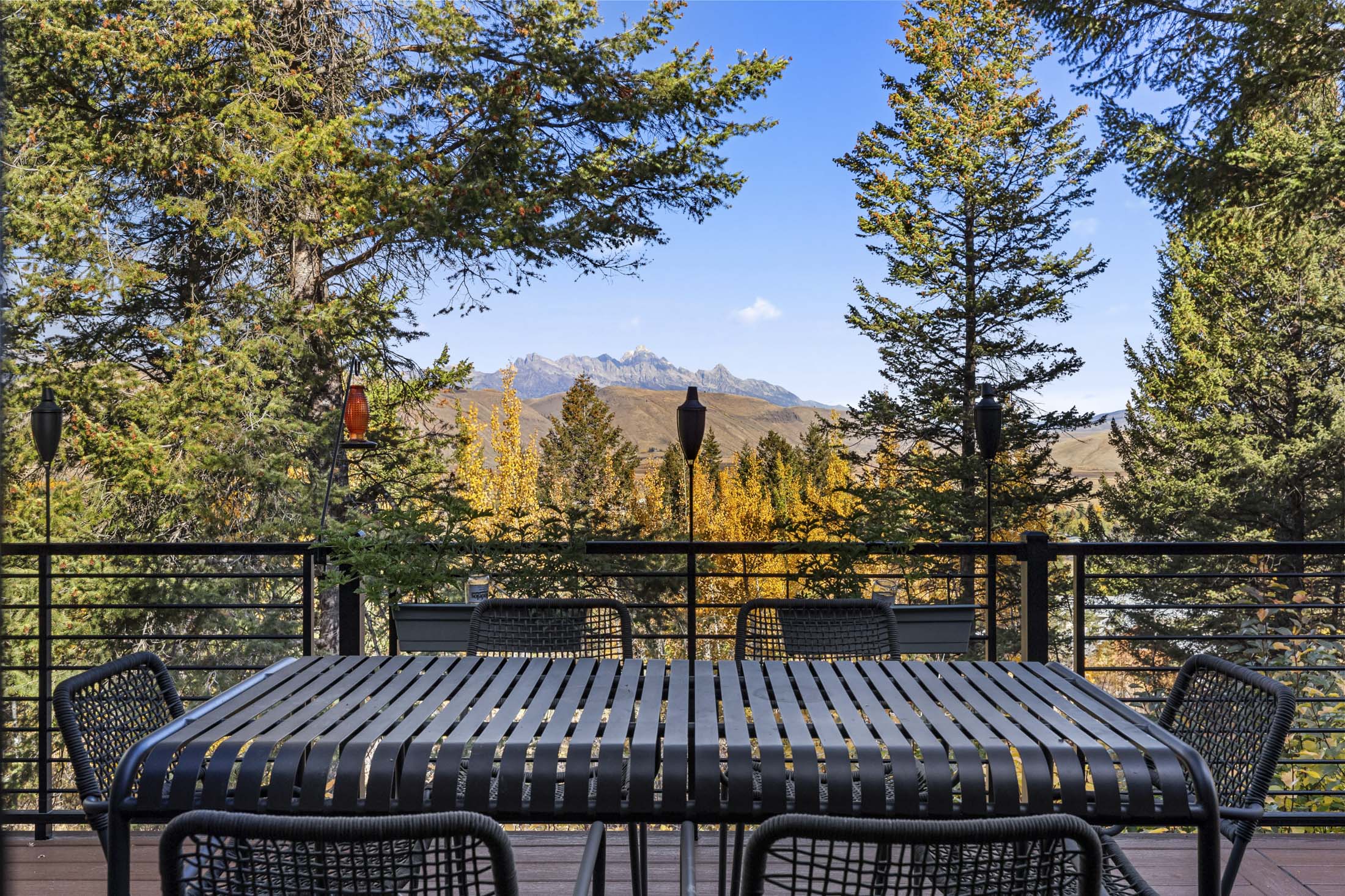 A deep, wraparound deck functions as an extension of the living space during warmer months. Its depth and orientation support dining, lounging, and quiet evenings overlooking the Tetons, while surrounding trees and elevation keep neighboring homes largely out of sight, reinforcing a sense of privacy that is uncommon for in-town living.