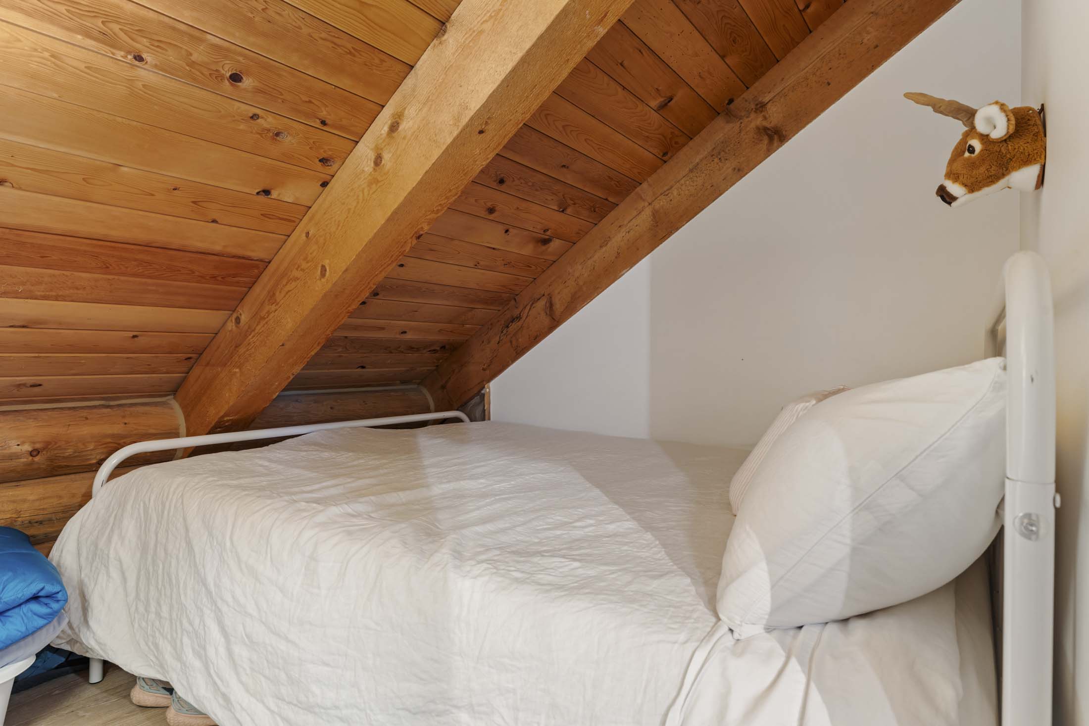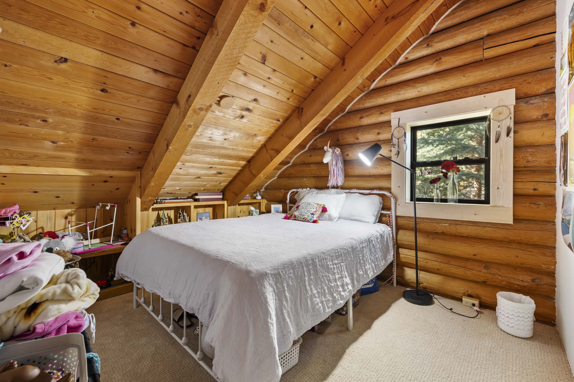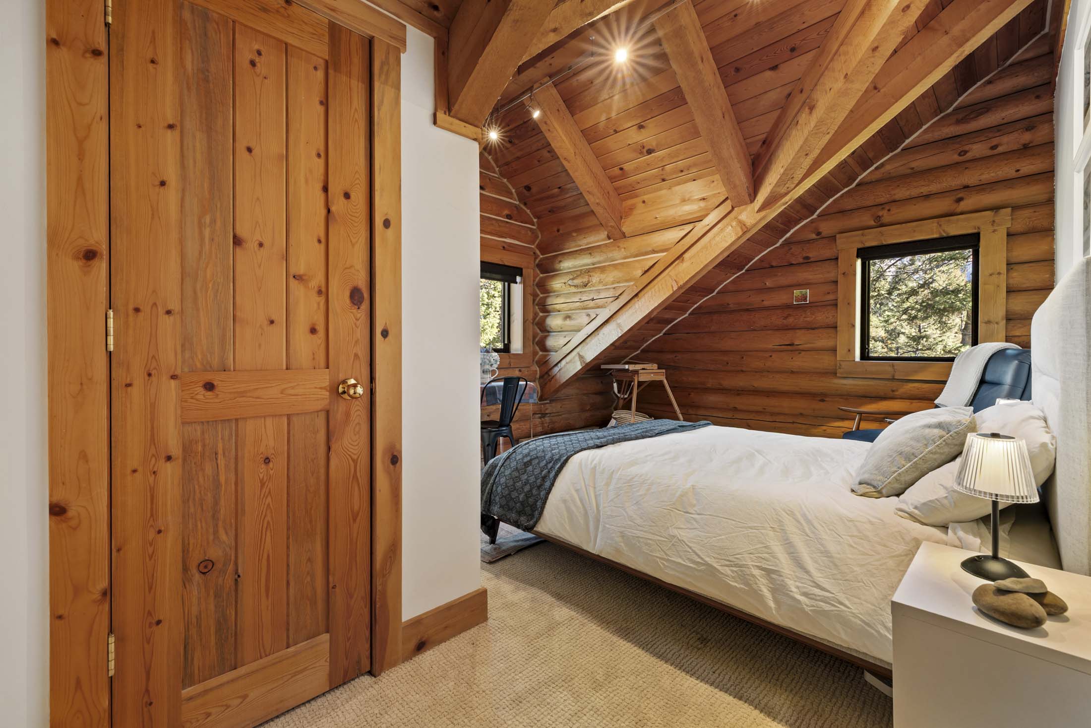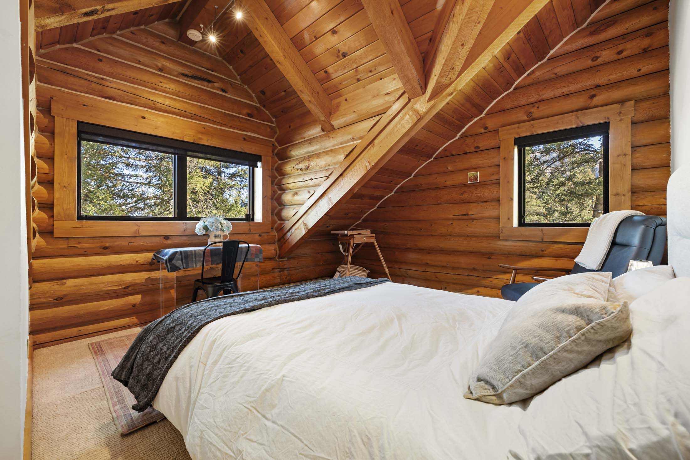 The layout now extends well beyond a traditional two-bedroom cabin. The main level includes a ground-floor bedroom and bath. Upstairs, the upper level has been reconfigured to include an additional bedroom, along with flexible space suitable for use as an office or sleeping nook, allowing the home to comfortably adapt to guests, remote work, or evolving lifestyle needs.