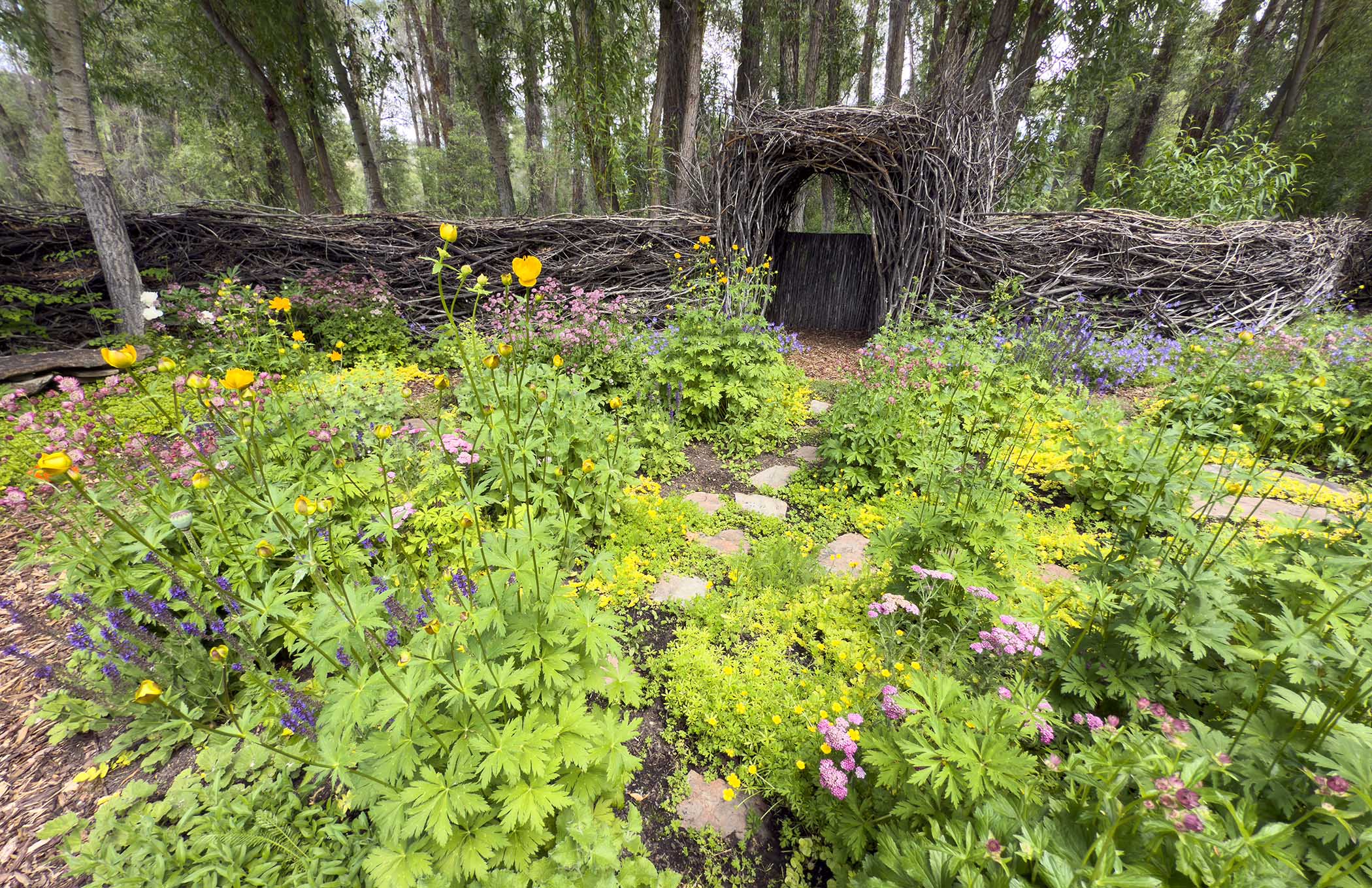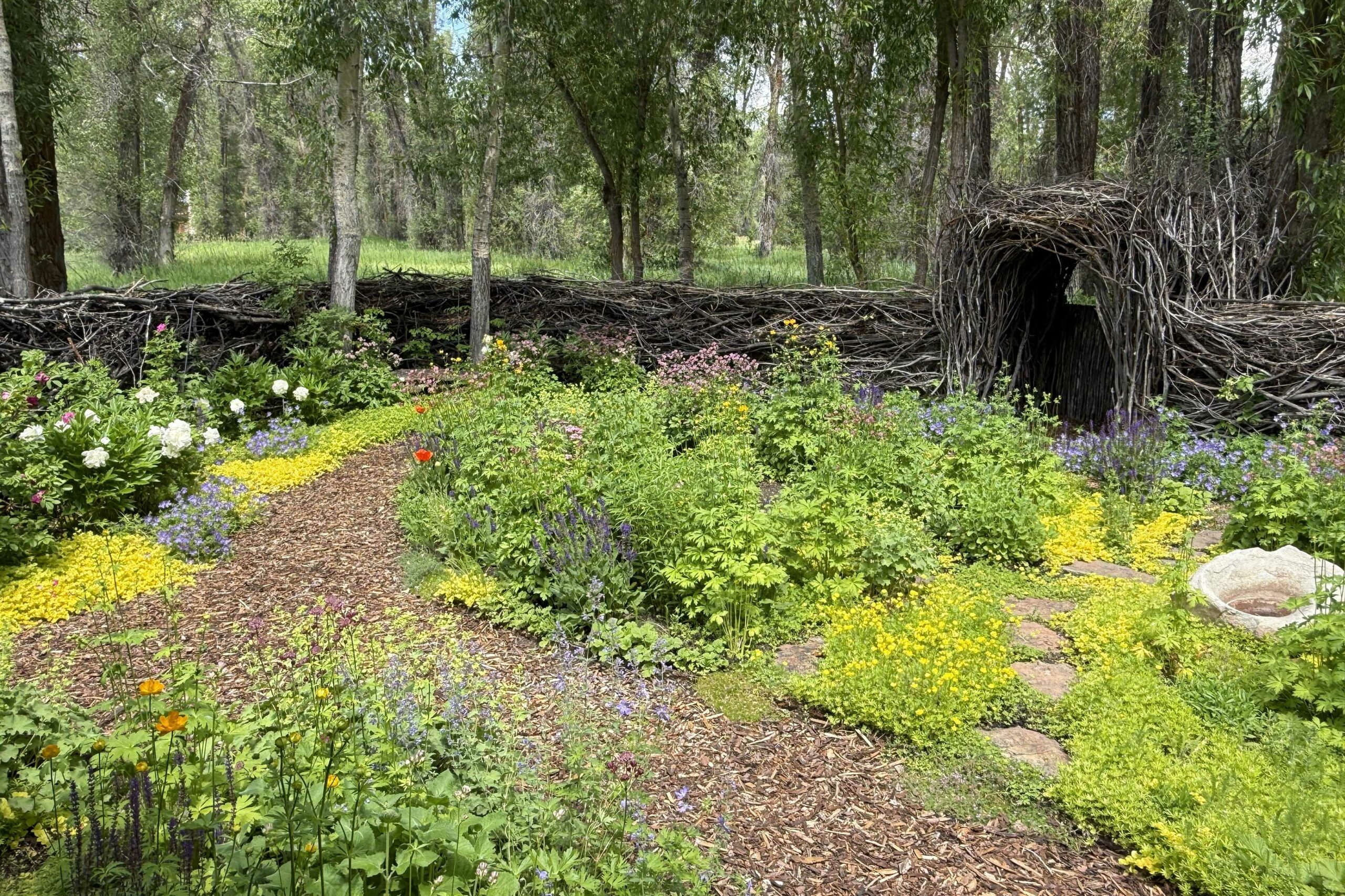 Just beyond the house, a hand-gathered willow-branch fence encircles a kitchen garden with drifts of perennials, wildflowers, groundcovers, penstemon, poppies, thyme, campanula, roses, and more. Curving mulch paths and stepping stones weave through the plantings, leading past a moss-covered rock birdbath. A simple stone bench offers a quiet place to pause and reflect.