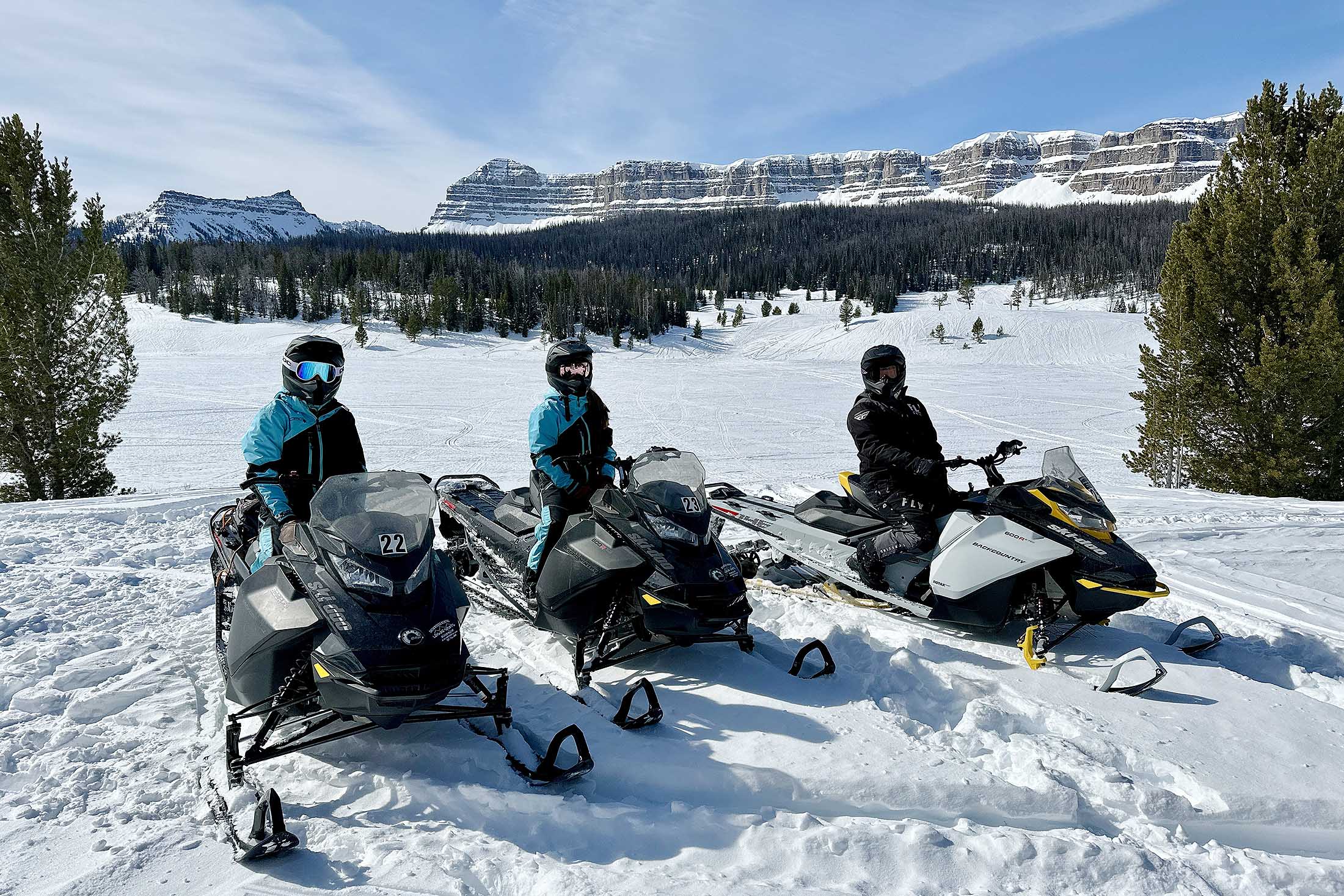 Pinnacle Buttes and the surrounding peaks rise dramatically above the basin, creating a sense of isolation and scale that few places can offer. The riding here is relaxed and beautiful, the kind of winter landscape that stays with you long after the engines are off.